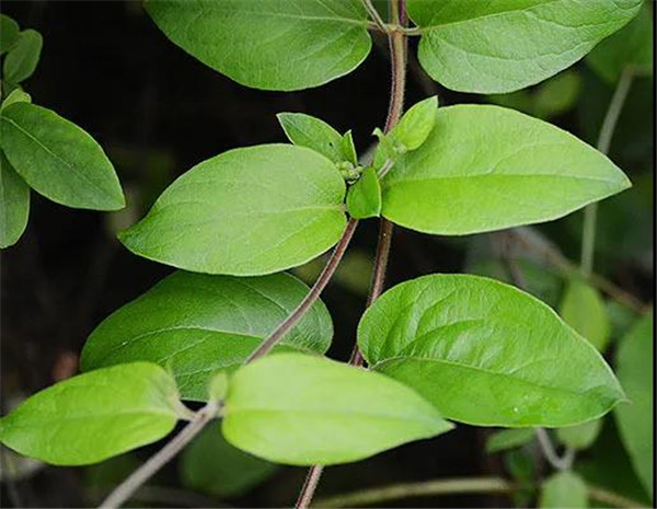 金银花的小枝细长,叶片卵形对生,花梗通常单生于小枝上部叶腋,花梗上又成对长出花蕾。
