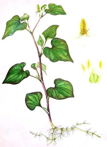 鱼腥草为多年生草本,全株有腥臭味,茎上部直立呈紫红色,下部匍匐为白色,节上轮生小根,叶片互生,基部心形,薄纸质,卵形或阔卵形,全缘,叶片背面常紫红色。