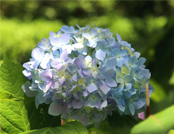 绣球(Hydrangea macrophylla),虎耳草科绣球属的植物,常于基部发出多条放射枝,形成一簇圆形的灌丛,锯齿状的叶片呈倒卵形或宽椭圆形。聚伞花序近球形,花球大而美丽,是常见的观赏花卉。绣球的花多是不育花,我们看到的“花”其实是它的花萼;内部的孕性花很少,花萼筒杯状,花瓣阔椭圆形至近圆形。绣球花Hydrangea希腊原文的意思为水杯,花型也长得像水杯,可见其生长需要充足的水分,夏天更是需要一天不落地给它浇水。