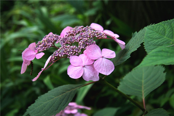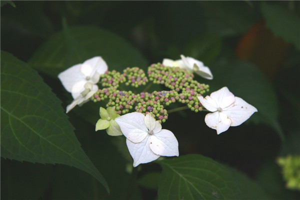粗齿绣球,叶片具有非常明显的粗锯齿。原产地在朝鲜、日本境内的山区地带,因此在原产国又被叫为“山绣球花”。花型像一顶迷人的花边帽,由外侧大朵显眼的不育花萼片环抱着中间密密麻麻的细小而梦幻的孕性花。
