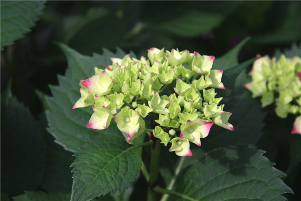 带桃红色花边的绣球,花朵球形,中间白色至淡粉色,有时花瓣边缘出现锯齿状。秋天的时候,叶子会变成紫红色。