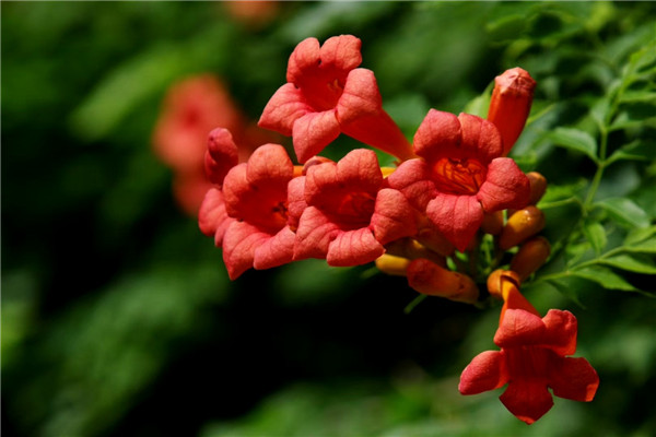 初夏时节,武汉植物园花径大道的藤廊上朵朵火红的花儿点缀着绿叶屹立于枝头,这便是凌霄花热情绽放的样子,十分美丽耀眼。