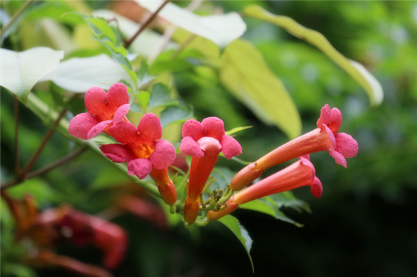 生性强健的凌霄,借助于自身的气生根,攀援于山石、墙面或树干之上,根沾土即活,茎沾土即长,虽默默无言却用自己的行动展现了一个决不妥协的攀援者风采,她顽强攀援、拼搏向上的精神正是人生爱拼才会赢的真实写照。