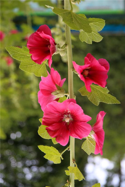 蜀葵(Alcea rosea Linnaeus)是锦葵科蜀葵属植物,植株高大挺拔,其颜色鲜艳而丰富,花开五色,有红色、紫色、黄色、黑色、白色,以红、白二色最常见,有单瓣与重瓣之分,常被称作“五色蜀葵”。“五色”象征阴阳调和,正是端午的主题。仲夏时节,七点开始盛放的一朵朵大花直立在笔直笔直的茎秆上,远远看去一片绚丽多彩。