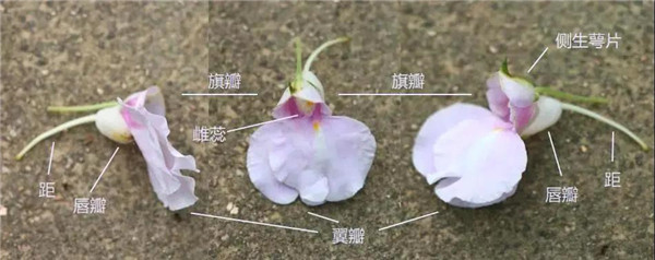 凤仙花的结构,主要包括型同凤尾、凤翅、凤身、凤颈的翼瓣、旗瓣、唇瓣、距等结构