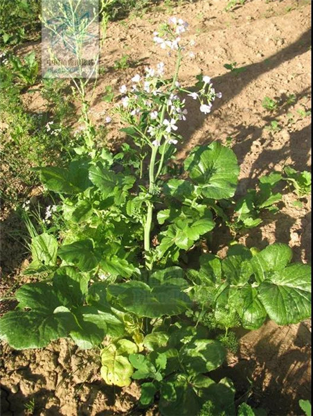 其直根肉质,长圆形、球形或圆锥形,外皮绿色、白色或红色;茎有分枝,无毛,稍具粉霜;花白色或粉红色,花瓣有紫纹;花期4-5月,果期5-6月。