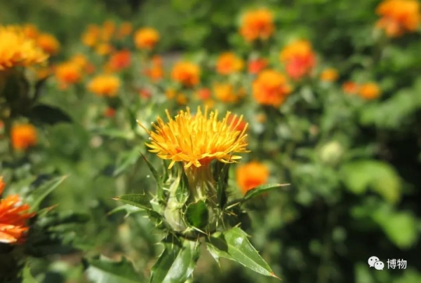 还有更迷惑的呢,红花最初叫红蓝花,《博物志》称它为黄蓝,《古今注》称它为红蓝。不过它实际和蓝色没什么关系,红花初放时的花冠就是黄色的,成熟后,花冠逐渐变为橘红色。
