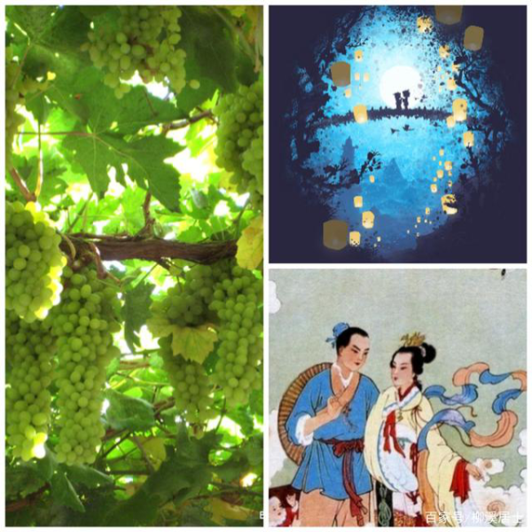 同时葡萄也具有美好的文化内涵,唐朝刘禹锡描写葡萄“种此如种玉”,明朝诗人夏言描写葡萄“满架明珠,一林苍玉,六月涵冰雪”,在古人眼中,葡萄代表着晶莹剔透和纯洁美好,这与人们向往的爱情也非常契合。而且葡萄的结果期在八至九月,七夕节正好是葡萄枝繁叶茂、硕果累累的时期,这个时候在葡萄架下既可以乘凉,又可以一边闻果香、品佳果,一边偷听牛郎织女说情话,好不惬意!