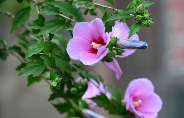 木槿,原产我国,是锦葵科的落叶灌木,木槿花绚丽缤纷,拥有多种颜色,白色、粉红、紫色等,因此木槿也叫白饭花、大红花等,而木槿的花型似喇叭,所以也叫喇叭花。木槿也是我国最早被人们认识的传统花木之一,早在《诗经》中就以木槿花来比喻女子的美貌:“有女同车,颜如舜华……有女同车,颜如舜英。”诗中的“舜”,就是指木槿。木槿株型优美,花色绚丽,从古至今都是人们所喜爱的植物。