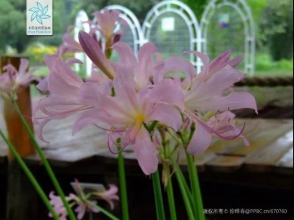 玫瑰石蒜的花茎和花朵都是淡玫瑰红色,花瓣中度反卷和皱缩。