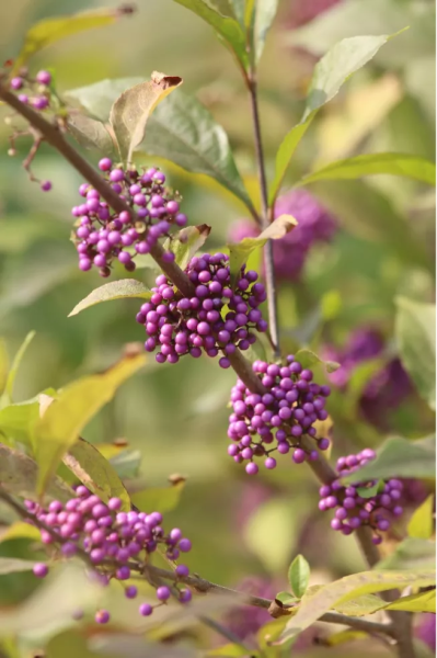 紫珠(Callicarpa bodinieri Levl.)是唇形科紫珠属的灌木。小小的果实,一簇簇地聚集在枝上。果实像一颗颗小圆球,成熟时呈紫色,光泽鲜艳,具有很高的观赏价值。在精品园里走上一圈,准会被各种各样的紫珠所惊艳。若是能串上一串这样的紫珠项链,应该很美吧。