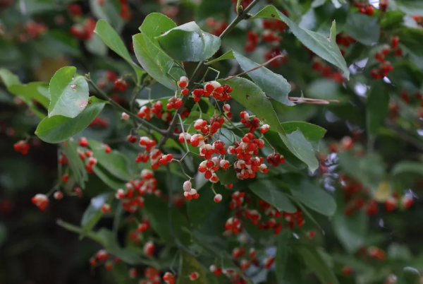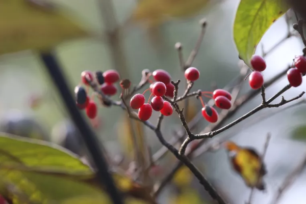 看完卫矛的果实,索性将红色看个够。南天竹(Nandina domestica Thunb.)是小檗科南天竹属的常绿小灌木。开花时,白色小小的花朵聚集成直立的圆锥花序,具有芳香味。果实是球形浆果,成熟时呈鲜红色的果皮里面包裹着扁圆形的种子。