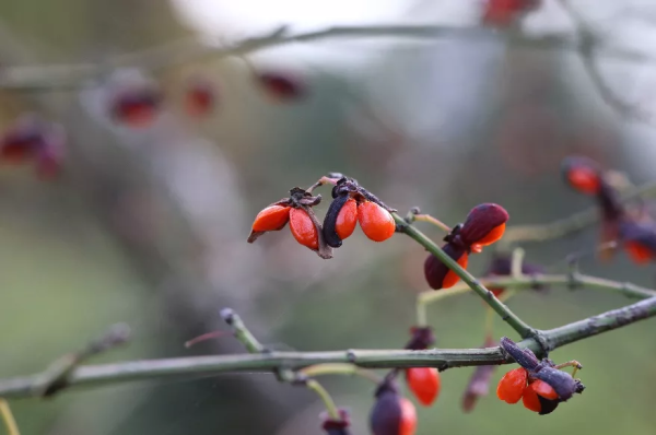 山茱萸(Cornus officinalis Sieb. et Zucc.)又被称为枣皮,是山茱萸科山茱萸属的多年生落叶小乔木或灌木,果实为核果,由绿色逐渐变成红色,完全成熟后是鲜红色的,跟指甲盖差不多大,像一个个迷你版的小西红柿,色泽鲜艳、饱满多汁。