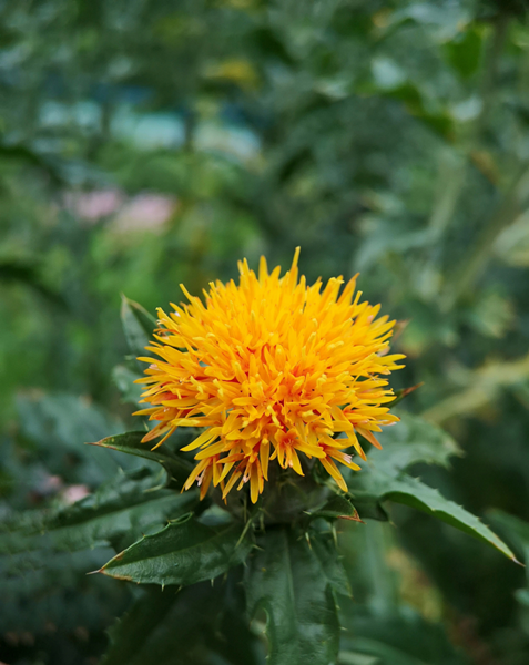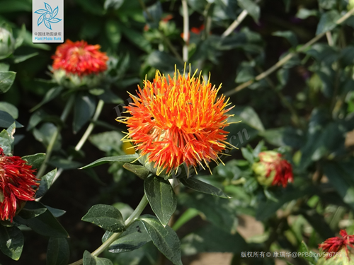 红花(Carthamus tinctorius L.)又名红蓝花、刺红花,是菊科红花属的一年生草本植物。其茎直立,茎中下部的叶子有锯齿,齿顶有针刺;红色的小花(初开时黄色)聚集成一个头状花序;瘦果乳白色,可榨油。