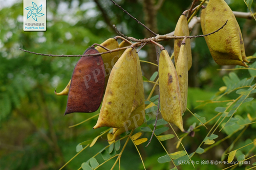 其枝干有稀疏的刺;叶为二回羽状复叶,羽叶对生,小叶纸质;花朵聚集成圆锥花序,绽放时花瓣黄色,最上面一片基部带粉红色,特别显眼;雄蕊稍伸出,花丝下部布满密密的柔毛,花柱细长,长有毛,柱头截平;果实是不开裂的红棕色木质荚果,有个外弯的硬硬的尖角,像鸟儿的嘴巴;种子长圆形,呈浅褐色。