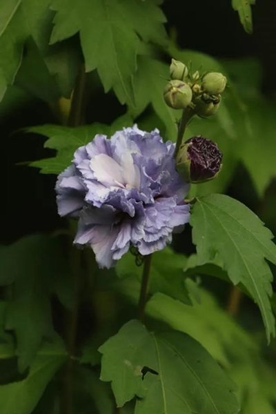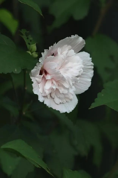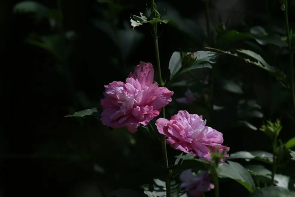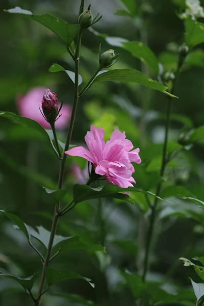 木槿花色丰富,有紫、红、粉、白等,花型有单瓣、半重瓣、重瓣之分。全世界有200个左右的木槿品种,在亚洲分布广泛。其品种之多,花色之艳,在木本花卉中也算是出类拔萃的“明星”。因此,古人常用木槿花来比喻女子的美貌。到了魏晋时期,人们充分认识到木槿开花繁盛、花期长,且集中在少花的夏季,适应性强、耐修剪、易造型,因此,木槿被广泛种植于宫廷及贵族庭院中,被文人雅士称为“神树”“嘉木”“丽木”等,直到今天,我们仍常可以看见用作行道树或花篱的木槿。