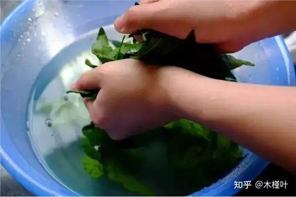 1、摘取适量的木槿叶片,洗净后,加入适量清水,用手揉搓,使其出汁;