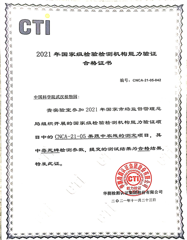 为提高公共实验平台检测水平,验证公共实验平台在仪器共享网中提供检验检测数据的可靠性,武汉植物园公共实验平台实验师姜颖参加了国家市场监管总局认可检验司组织的2021年国家级检验检测机构能力验证工作(简称国家级能力验证),其参加的能力验证项目“果蔬中农残的测定”测试结果为“合格”。