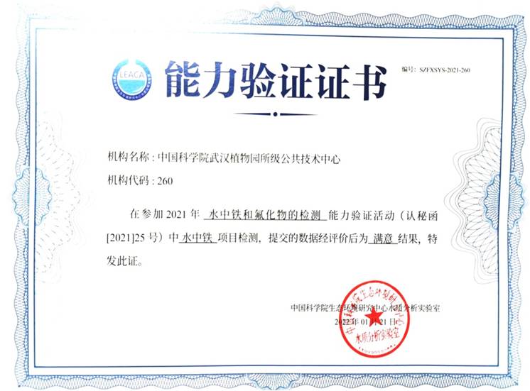 武汉植物园公共实验平台姜颖实验师参加了“水中铁的检测”能力验证项目,使用电感耦合等离子体原子发射光谱仪(品牌:PE;型号:OPTIMA 8000DV),在238.204nm(铁的测试波长)条件下对考核样品进行测试。日前收到项目承担单位的正式通知,武汉植物园公共实验平台在2021年度“水中铁的检测”能力验证项目中获得“满意”结果。