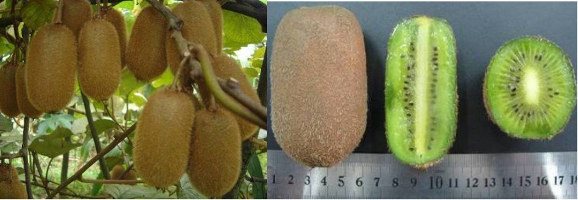 果实长圆柱形,平均果重85克,果顶椭圆,微凸;果皮褐色,有灰褐色较长的糙毛。果肉淡绿色、肉质细、脆,汁液较多,甜酸适度,清香可口,含可溶性固形物含量12 %~16 %、总酸1.5 %、维生素C 110 毫克/100克鲜重,品质优,是鲜食与加工兼用品种。
