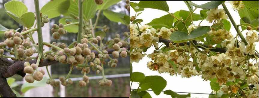 株型紧凑,节间短(1~5厘米),长势中等,1年生枝棕褐色,皮孔突起,较密集;叶片肥厚,叶色浓绿富有光泽,半革质,叶形近似卵形,叶尖端较突出,基部心形,叶片较小。花为多歧聚伞花序,每序4~5朵花,而普通中华猕猴桃雄花为聚伞花序,2~3朵花。