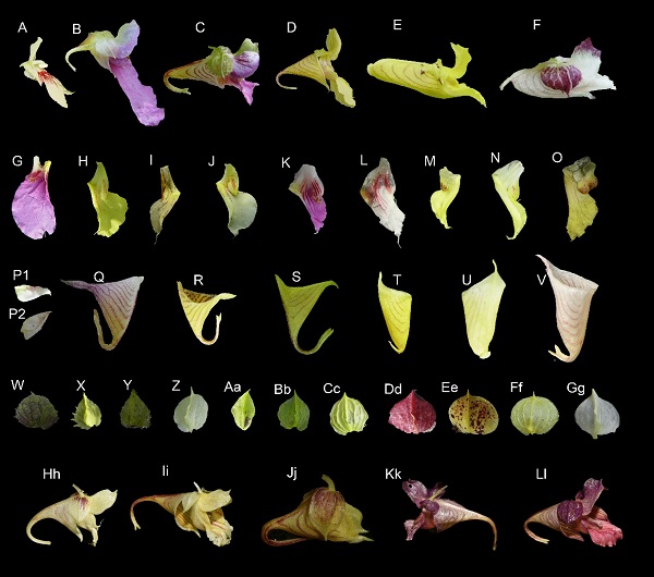 图2. 凤仙花长丝类群的花,侧萼,翼瓣,唇瓣