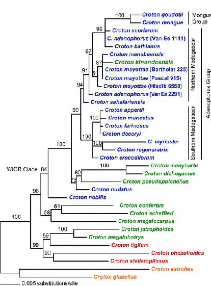 武汉植物园东非植物区系与分类学科组博士研究生Veronicah Mutele Ngumbau进行植物区系调查时,在肯尼亚东部海滨采集到一种大戟科植物。最初,根据它是灌木且叶对生,叶缘具齿等特征,将其鉴定为野桐属(Mallotus)植物。在对其DNA进行初步测序,查阅巴豆属植物文献之后发现,该种应属于巴豆属,且与马达加斯加及附近岛屿分布的一些巴豆属植物种类形态相似。但奇怪的是,它和东非大陆所有已知的巴豆属植物形态差异都较大。基于核基因ITS和叶绿体基因片段trnL-F的序列数据所构建的系统发育树中,该种镶嵌在巴豆属马达加斯加北部物种分支里面。形态和分子系统学方面的证据都显示该种和马达加斯加区域特有的巴豆属物种有很近的亲缘关系。在王青锋研究员和胡光万研究的指导下,与美国的波多黎各大学和密歇根大学的大戟科专家合作,进行了仔细的形态学比较和分子系统学研究,最终确定其为巴豆属植物新种,并属于巴豆属中原来被认为只在马达加斯加北部和科摩罗群岛分布的Adenophorus群(Adenophorus Group)的成员,因其模式产地为Kaya Kinondo森林,故将其命名为Croton kinondonesis G.W.Hu, V.M.Ngumbau & Q.F.Wang。