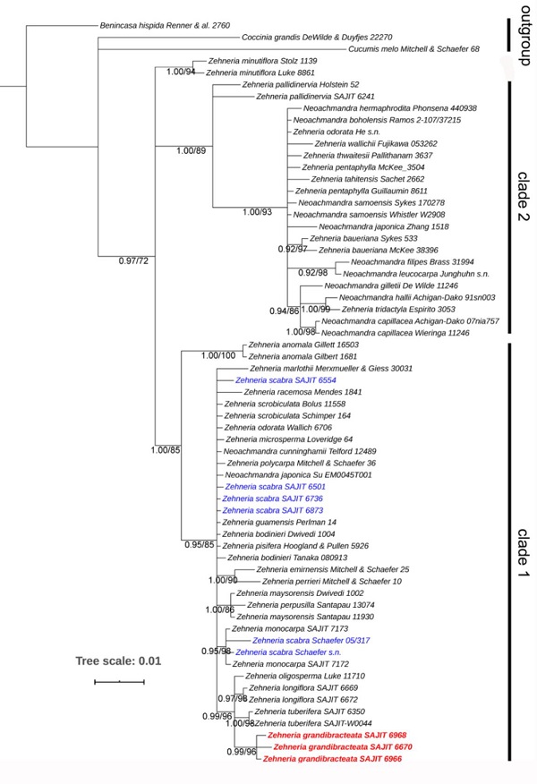在武汉植物园王青锋研究员和胡光万研究员的指导下,博士生魏能等人对东非的马?儿属植物开展系统分类学研究。在充分的文献查阅和标本比对基础上,开展了详尽的形态学研究,同时结合分子系统学分析,重建了该属系统发育框架。最终,将肯尼亚西部森林采集到的马?儿属植物,确定为从未被记载的植物新种;并根据其明显的叶状苞片特征,将其命名为“大苞马?儿(Zehneria grandibracteata G.W. Hu, Neng Wei & Q.F. Wang)”,以“Zehneria grandibracteata (Cucurbitaceae), an overlooked new species from western Kenyan forests”为题发表在最近一期国际植物分类学期刊PhytoKeys上。