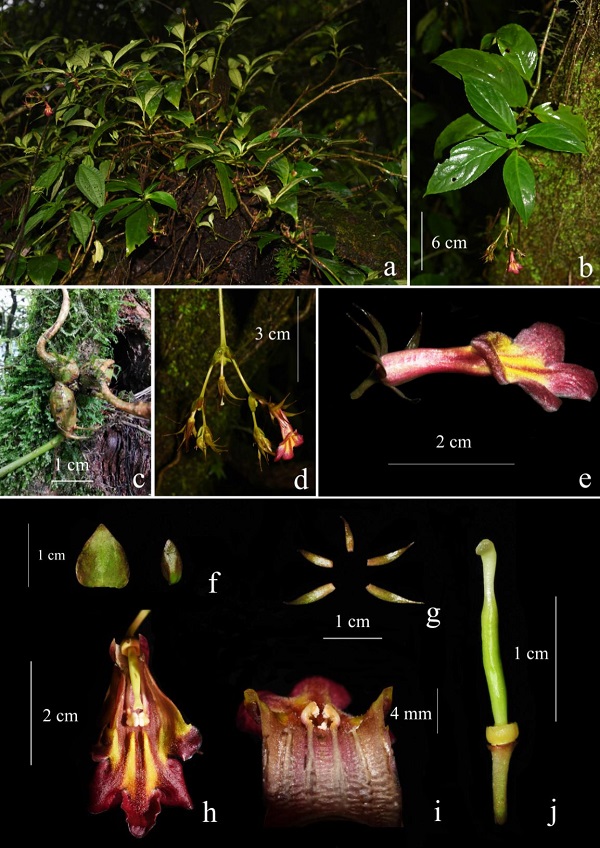 2019年6-7月,东非植物区系与分类学科组在对云南省盈江县进行野外调查时,在布满苔藓的树干和石头上发现1种形态特异的苦苣苔科植物,在我园王青锋研究员和胡光万研究员的指导下,学科组研究人员经过一年生物周期的观察,对其形态特征进行详细的描述对比、查阅文献和馆藏数字化标本(KUN、PE、E和TI等),确定它为新的植物类群,命名为猩红吊石苣苔(Lysionotus coccinus G.W. Hu & Q.F. Wang)。