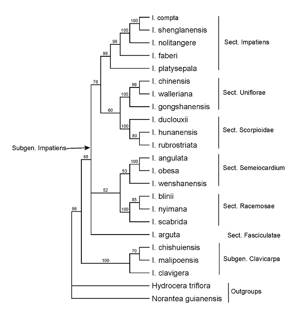 图版2:利用ITS, atpB-rbcL和trnL-F联合序列构建的凤仙花属系统发育树