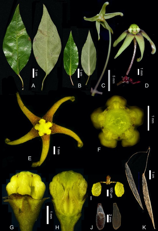 图2 三峡白前(Vincetoxicum pingtaoanum Cai F. Zhang, G.W. Hu Q.F. Wang)叶、花和果实的特写