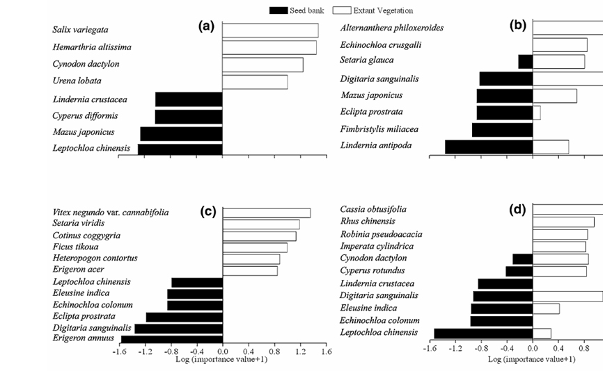 该研究表明,共有45个物种(20个科)从土壤种子库萌发,平均种子密度是4578 ind/m2(个体/平方米)。一年生植物在土壤种子库中占据优势,大部分地上植被中的木本植物和多年生草本植物没有在土壤种子库中出现,暗示一些非一年生植物通过土壤种子库恢复的可能性很小。因此,由于与地上植被物种组成相似性很低,且一年生植物占据优势,土壤种子库恢复三峡库区消涨带内建坝前植被的潜力比较低。但作为一个重要的繁殖体来源,在进行消涨带植被管理过程中,土壤种子库应该被考虑在内。该项研究结果已经在植物生态学研究领域主流期刊Plant Ecology正式发表(http://www.springerlink.com/content/f435754hv5732161/)。