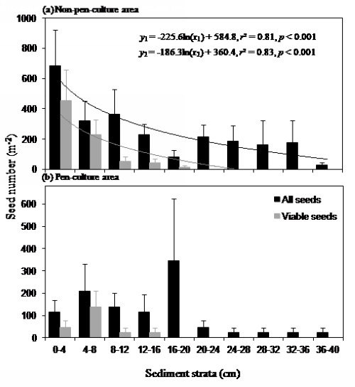 重点实验室湿地生态学科组肖蒇博士在刘贵华研究员指导下,通过对洪湖敞水区40cm深度的底泥种子库进行取样分析,结合两次植被调查数据以及3个时期的历史植被资料,发现湖泊种子库垂直分布格局在一定程度上可以反映出植被的演变历史过程。此外,在比较了三种不同利用类型的湖区底泥种子库结构后发现,无论是物种数目、种子总密度还是有活性的种子密度,非围网养殖区(non-pen-culture area)都显著高于围网养殖区(pen-culture area)。同时,在弃围区(abandoned pen-culture area),种子库对地表植被恢复的贡献潜力依然巨大
