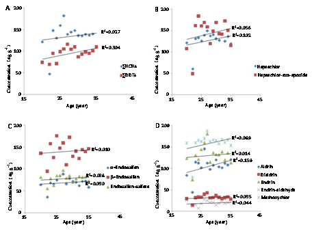 主要有机氯杀虫剂含量水平与女性年龄之间的统计分析