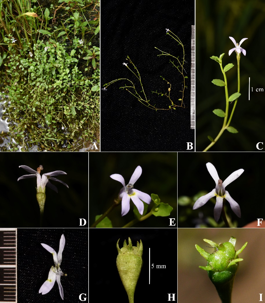 半边莲属(Lobelia),包含四百多种,为桔梗科(Campanulaceae)的第二大属,广泛分布于世界的热带和亚热带地区。Wimmer, Murata和Lammers等人先后对该属进行分类修订,使该属的属下分类系统逐步完善。我国境内该属分布有23种,其中6种为特有物种。2017年,在广西桂林临桂县的一次水生植物类群采样过程中,一种花冠结构特殊的半边莲属植物吸引了考察人员的注意。随后,考察人员在邻近区域又发现了该半边莲的另一居群,压制了足够的标本,并将部分活体植株栽培于武汉植物园温室,留待后续的观察实验。