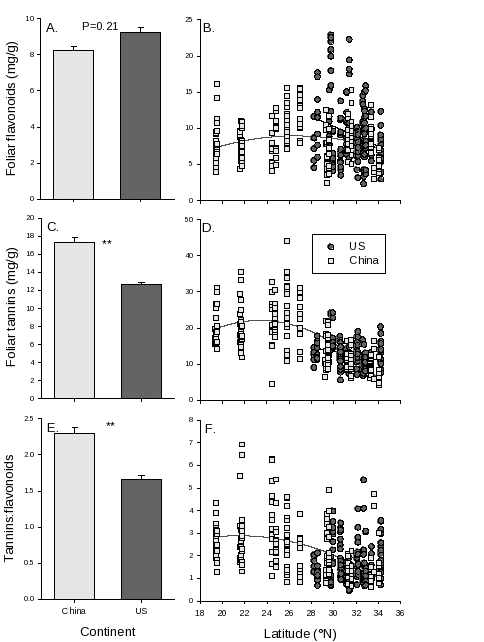 研究结果表明,原产地乌桕叶片单宁浓度和昆虫(咀嚼式,刺吸式)的取食压力要高于入侵地。单宁与类黄酮的分配在原产地随纬度降低,而在入侵地没有纬度梯度变化。对以往发表的同质园实验中乌桕次生代谢物数据的分析表明,遗传差异会导致原产地和入侵地之间的化学浓度差异。野外数据进一步表明,在原产地中国,乌桕次生代谢产物的纬度模式主要是对生物因子的表型可塑性响应,而在入侵地美国,次生代谢产物的纬度变化主要是对非生物环境的表型可塑性响应。