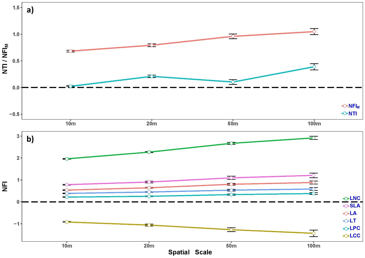 1:八大公山样地内净最近种间亲缘(NTI)关系指数与净最近功能类群指数(NFI)的尺度效应