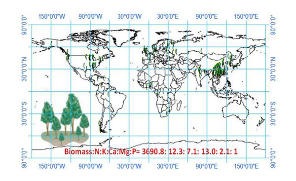 中国科学院水生植物与流域生态重点实验室系统生态学学科组科研人员在张全发研究员带领下,构建了一个生态参数用来衡量林木在群落水平的养分利用效率:Biomass:N:K:Ca:Mg:P。通过计算发现,全球森林的平均Biomass:N:K:Ca:Mg:P约为3691:12:7:13:2:1。这意味着,森林每吨生物量中,固定了3.3千克氮、1.9千克钾、3.5千克钙、0.6千克镁、0.3千克磷。人们在收获和利用林木产品时,会从生态系统中带走相应数量的养分。如果没有得到有效补充,森林生态系统的地力将日益贫瘠。