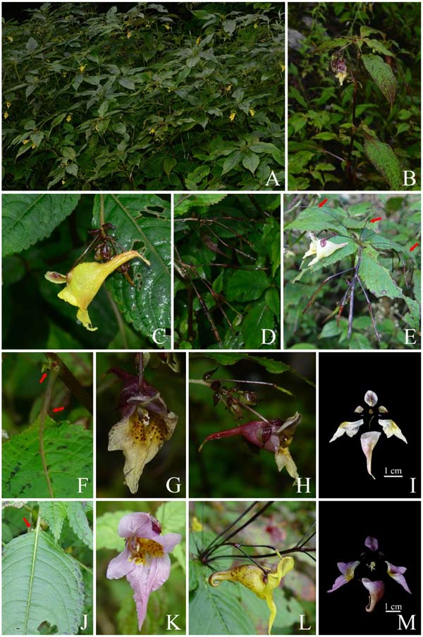 图1 姚家坪凤仙花(A-I)和丝序凤仙花(J-M)