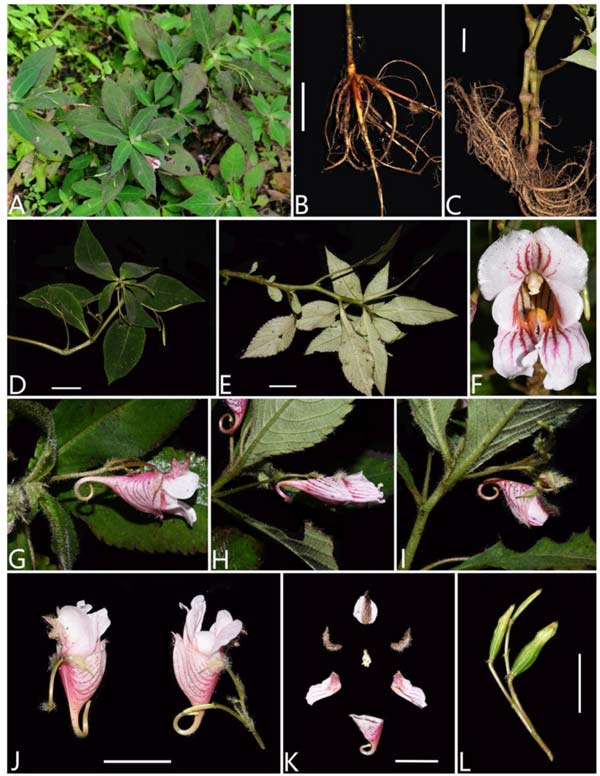 姚家坪凤仙花于2021年7月在云南省泸水市被发现,形态上近似于丝序凤仙花(Impatiens sterilis Y.Y.Cong & Y.X.Song),但可以通过它长圆形或卵状长圆形的叶片,具1–3对棒状腺体的叶柄,多少被毛的花梗,宿存的苞片和笔直的距等特征进行区分(图1)。隆阳凤仙花于同年10月在云南省保山市被采集到,它在形态上与上江凤仙花(I. shangjiangensis Y.Y.Cong & J.Z.Gu)相似,但可以通过它不带有腺体的叶柄,卵状披针形或披针形的叶片,更短的花梗,卵形的苞片,更长的距,近圆形的旗瓣等特征区进行区分(图2)。系统发育分析结果表明它们均属于本属总状花序组(I. Sect. Racemosae)。