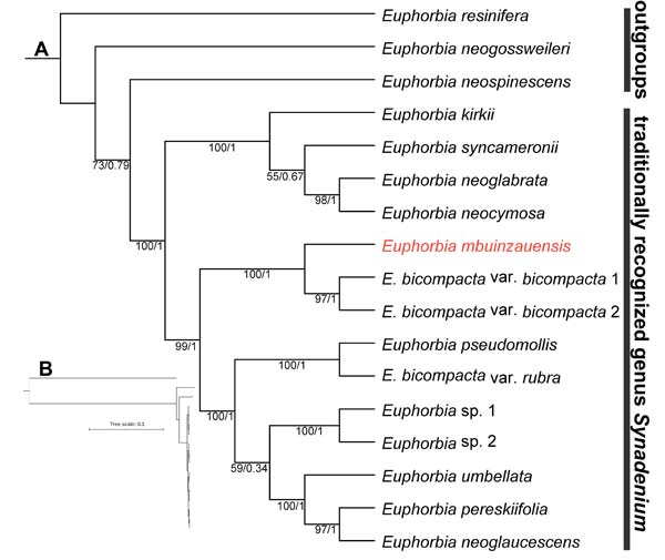 本研究首次从分子系统学的角度,确认了(原)彩云木属的单系地位,提供了首个大戟属彩云木类群的系统发育框架。值得一提的是,ITS(internal transcribed spacer,内转录间隔区)序列在绝大多数物种中表现出广泛的序列多态性,因而被广泛用于系统发育研究中,但ITS序列(约0.7 kb)并不能为大戟属彩云木类群提供足够的系统发育信号位点。而将序列扩展至核糖体DNA全长(约10 kb),基于此全长序列推断的拓扑结构,才能确定该新种的系统发育位置。大戟属彩云木类群物种间序列差异微小,表明其可能为近期辐射分化产生。