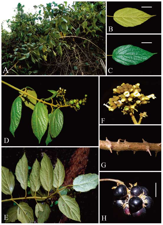 E显示叶在远轴面排列方式的枝条;F花序;G带刺的茎;H成熟的果实
