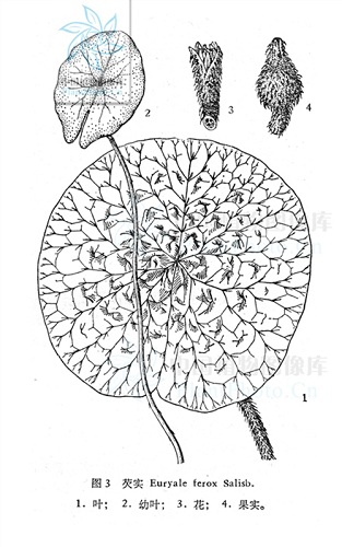 鸡头米选手全株具剌,具有二型叶:初生叶为沉水叶,箭形或椭圆形,两面无刺;次生叶为浮水叶,革质,椭圆状肾形或圆形,盾状,全缘,上面深绿色,具蜡被,下面带紫色,被短柔毛,两面在叶脉分枝处具锐刺;叶柄及花梗粗壮,均被硬刺。