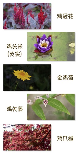 又是一年动物界赢了,虽然鸡肚子上有牡丹花的点缀,但为什么植物只能是配角呢?如果选择植物作为鸡年吉祥物,又有哪些参赛者呢?在中国植物志中搜索中文名带有“鸡”字的植物,有近300个参赛者,别名中带“鸡”字的植物也有两百多个。