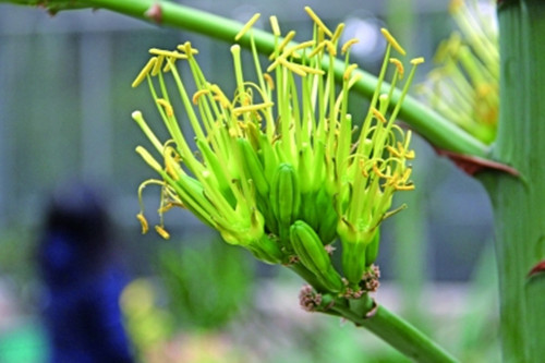 这株龙舌兰生长在景观温室的多肉多浆室内,一个多月前花序开始从叶丛中抽出,后迅速长至3.5米。现在花轴两边已经长出40个侧枝,结出100多个花簇,黄绿色花簇由下向上依次开花。凑巧的是,景观温室内还有一株皇冠龙舌兰也已抽出花序,即将开花。幸运的话,过几天市民们将见到极罕见的两株争妍奇观。