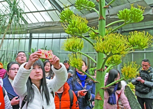本报讯(记者甘娟 通讯员陈长丽)龙舌兰被称为“世纪植物”,是世界上最难开花的植物之一,原产于美洲沙漠,寿命一般100年。一株健壮的龙舌兰一般要长到七八十岁才能开花,穷其一生只为开花一次,有世界“最稀罕花卉”之誉。然而,近日,武汉植物园景观温室内的一株龙舌兰居然开花了,让不少游客大开眼界。