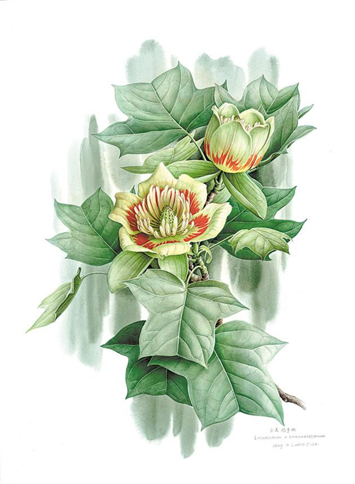 此次特展汇聚了大量湖北特色植物,胡光万特别提示大家可以关注一幅鹅掌楸作品。
