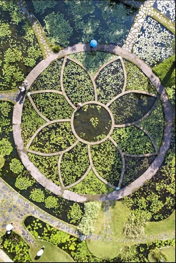 武汉植物园中的睡莲展示区每个花瓣形的水池内都栽种有不同色系睡莲,其中包括印度红睡莲、埃及蓝睡莲、墨西哥黄睡莲、中国延药睡莲、泰国招财女神等珍奇品种,俯看睡莲池就像一朵巨大的“睡莲”,凸显着世界各地睡莲姿态,是园内一道亮丽持久的风景。