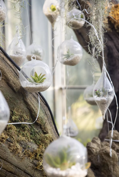 透明玻璃球高低错落,空气凤梨恣肆生长,红掌点缀其间。