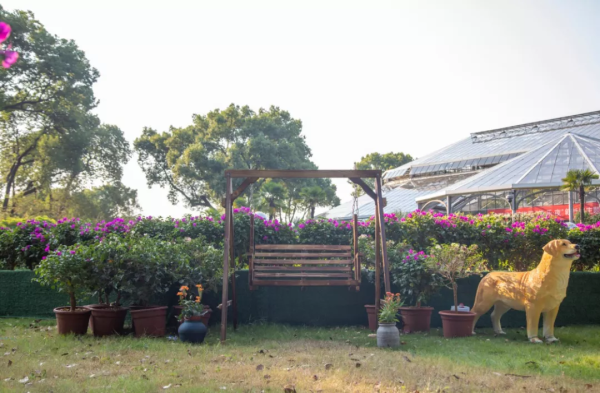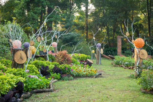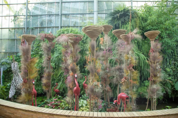 兰花室则被装点得格外奇妙多姿。披上彩衣的“怪怪树”令人联想到草间弥生的波点艺术;彩色毛线与非洲菊、鸟尾花交织成丛林之光;粉黛乱子草和满天星呼应着宫崎骏的《风之谷》。